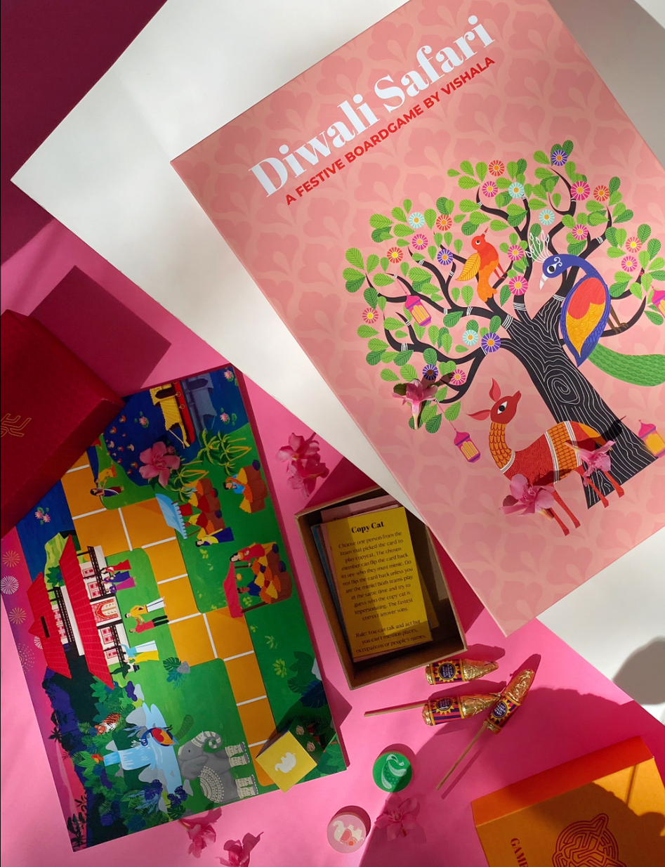 Diwali Safari is a board game that serves as an ode to Indian wildlife and biodiversity. It features Gond tribal art, a unique style of painting that sees every animal, plant, and tree as sacred.